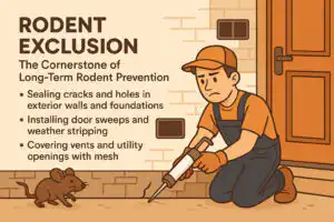While traps and bait can reduce rodent populations after they’re already indoors, exclusion prevents the problem entirely. Without sealing access points, you’re simply treating symptoms—not the root cause.